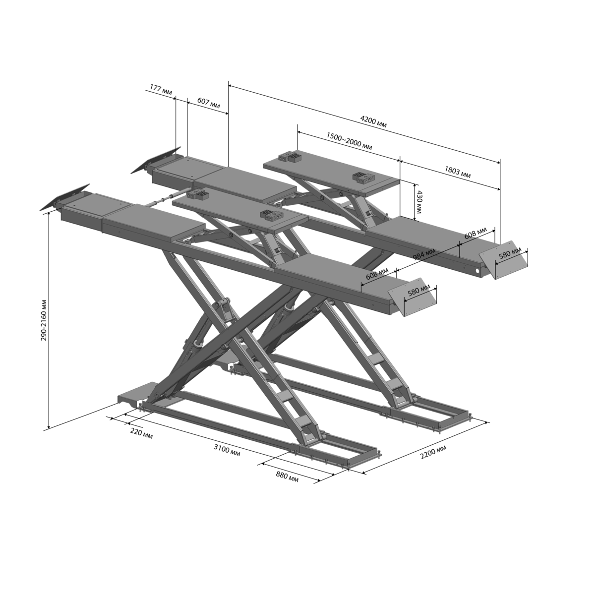 Встроенный в гладкие платформы ножничный подъемник второго уровня для вывешивания колес автомобиля имеет: