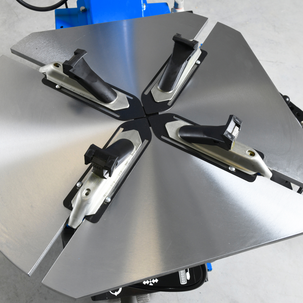 • Четырехкулачковый механизм позволяет надежно зафиксировать колесо на рабочем столе. Кулачки оснащены пластиковыми накладками